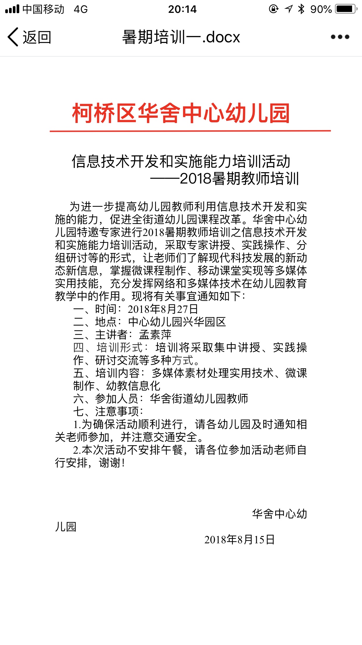今天上午我走进华舍中心幼儿园为华舍街道的老师们做培训,用移动课堂投屏演示的功能像老师们介绍了自己利用活动广场开展我园暑期安全防溺水活动的一些情况,一起欣赏了孩子们上传的作品,童真童趣的回答让我们看到了网络学习空间之于学前教育教学的重要作用。受培训的老师们感觉此项应用非常适合幼儿园开展一些家园互动的活动。此外基于微课的课前导学实施翻转课堂的课堂教学应用,老师们也感觉和幼儿园的课程实施有很多异曲同工的地方,,只是应用网络学习空间更能立体的感觉孩子学习的过程,非常值得试一试。非常感谢华舍中心幼儿园领导的支持,老师们对空间的应用也非常感兴趣,能让一部分老师学习应用起来,能觉得应用确实有价值,对我来说也是研究教育技术应用的信心来源。