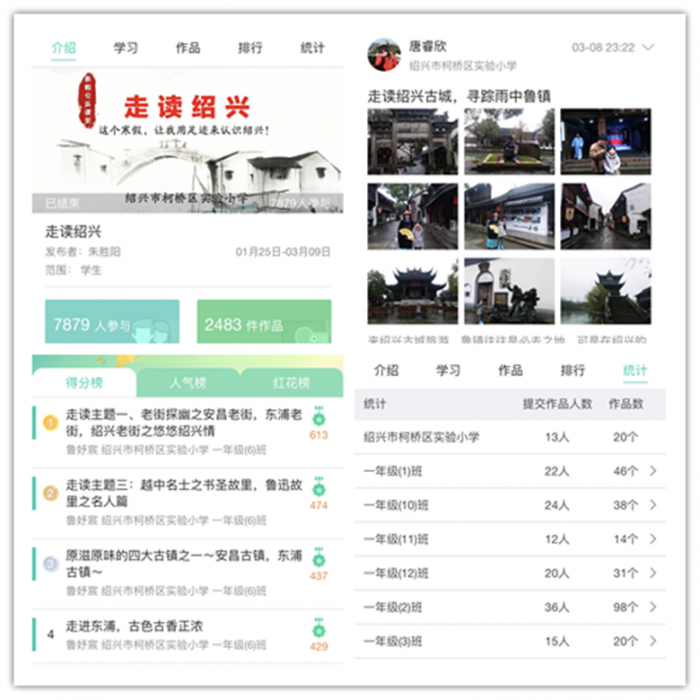 随着柯桥区教育资源公共服务平台“寒假公益课堂”的推出,实验小学在“柯桥智慧校园”活动广场中如火如荼地开展着“走读绍兴寒假研学旅行”实践活动。实小老师全力支持,实小家长高度认可。短短一个寒假,参与研学游人数达7878人,递交作品2483件,实小学子可谓是过了一个充满意义的寒假。