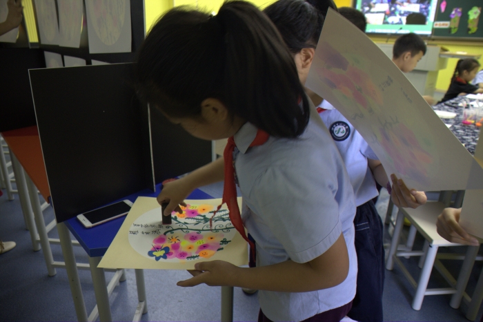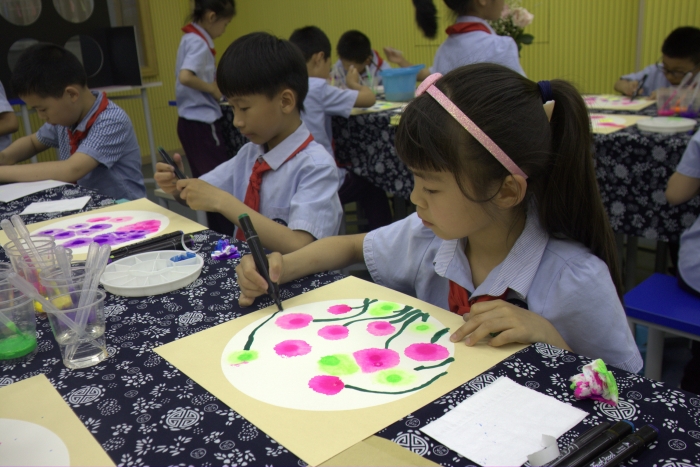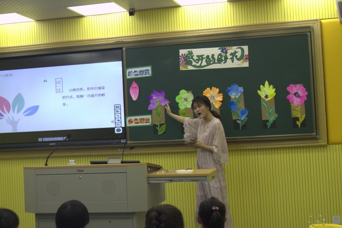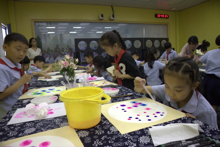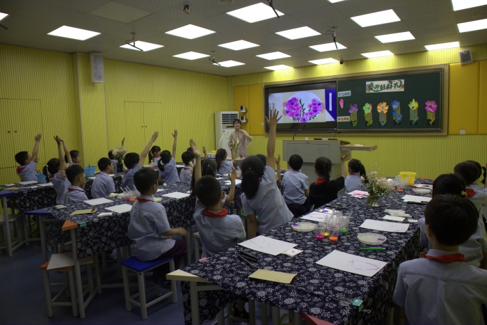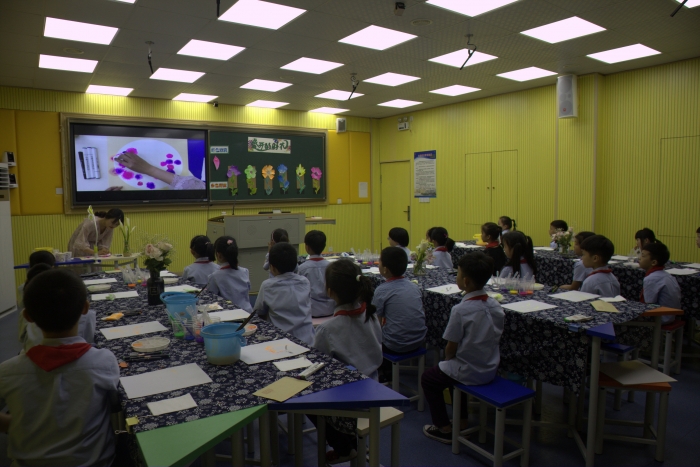 5月23日,来自宁波市鄞州区教师团和桐乡市崇福镇志华中心小学的骨干教师莅临我校,共同参与我校“智慧课堂”教研组活动。朱佳滢老师执教美术课《盛开的鲜花》,朱老师用手机同屏、随堂直播等功能,聚焦、演示了教师的示范,放大、展示了学生用滴管绘制渐变色花的过程。技术的介入,使隐性的、不可见的学习能够清晰地展现在每个学生的面前。