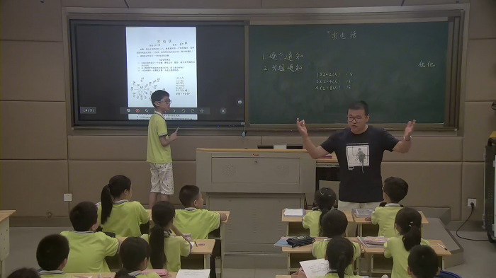 上午第一节,由安昌小学的陈晓峰老师执教小学数学五年下册《打电话》。陈老师从四年级学习的“数学广角—优化”的知识点引入,温故旧识,课堂上利用表格的形式,让学生通过观察、分析,克服思维的表面性,抓住事物的内在规律和本质特点,建立数学模型,进一步体会优化思想,让学生感受到生活中处处都有数学问题,同时又提高了学生的人文素养。