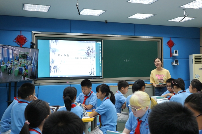 此次推进会的第一项议程,是实验小学对稽江小学的城乡同步课堂展示。实验小学的陈飞琴老师从“解诗题”、“说诗意”入课,带领实验小学和稽江小学的孩子们与于谦“对话”。在稽江小学干金海老师的辅助下,课堂打破城乡空间的距离,成功实现两地学生实时交流,互学互评。为接下来柯桥区“互联网+义务教育”结对帮扶工作的顺利推进,起到了良好的示范作用。