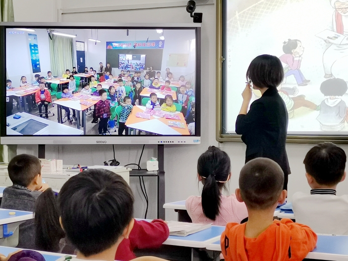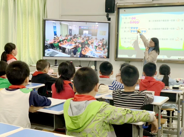 当天三位老师分别给班竹小学的一、三、四年级的孩子们上了三堂语数课,而柯岩小学的学生则在录播教室接受他们老师远在那一端的同步教学。这样的课堂岩小学生第一次尝试,他们静静地聆听着屏幕那边传来自己老师的声音,一起跟着老师的指令回答各种问题,和兰亭的学生一起在自己老师的带领下读课文、合作学习新知识……老师亲临原本不熟悉的环境但能与不熟悉的学生亲密接触,同时老师因为熟悉自己的学生,隔着屏幕也能兼顾到远端的学生,因此双方学生的学习积极性较以前了有了很大的提高。这种新型的同步课堂模式得到了双方老师的一致好评。