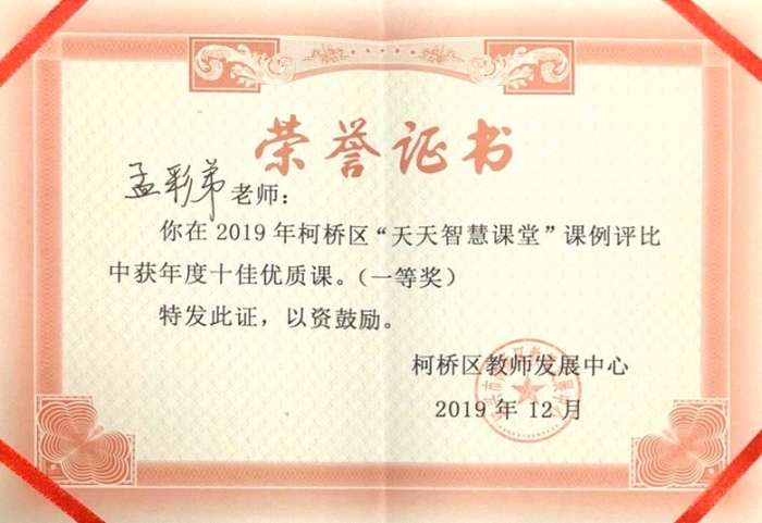 在刚刚结束的柯桥区第五届智慧课堂教学实践观摩活动中,我校孟彩弟和俞杰两位老师再获殊荣。孟彩弟老师夺得第五届天天智慧课堂年度十佳优质课,俞杰老师获得第五届天天智慧课堂年度优课。这是继2018年赵霞和徐铁柱老师获此殊荣以来,我校教师再一次取得这样好的成绩。