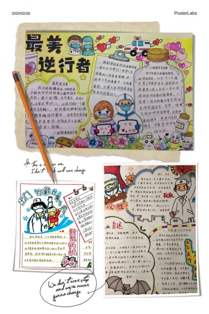 【停课不停学】新型冠状病毒感染的肺炎疫情牵动着亿万人民的心。在全国上下众志成城抗击新型冠状病毒的日子里,华舍小学学子们积极开展防疫行动,通过绘画,书法、越剧新编、做手抄报等方式助力疫情防控。在这里,我们要向所有白衣战士致敬!是你们在前线守护着人民的安康,是你们点亮了患者的生命之灯;在这里,我们要向所有防疫一线的工作志愿者们致敬!是你们放弃团聚踏上驰援的征程,是你们唱响了保佑生命的大爱之歌。