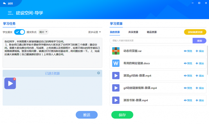 课前,利用教学助手或人人通空间的课前导学,布置个性化导学案,助力翻转课堂。