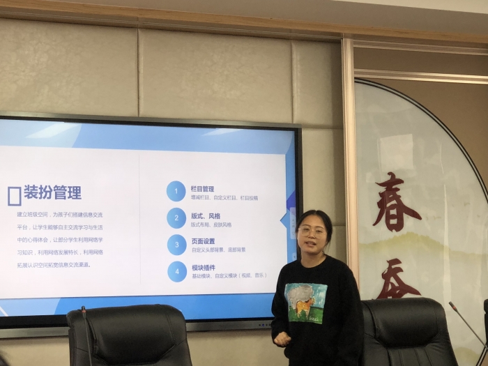 首先,何老师从班级基础信息管理、成员管理、空间栏目设置、空间首页装扮等方面来介绍班级空间。其次,何老师还邀请我校徐老师上台互动,在了解徐老师空间建设的短板后,有针对性地进行细致讲解,高效地解决了教师们心中共同的困惑。最后,何老师针对教学助手中的智能检测进行了简单的介绍,包括如何利用公共题库组卷;如何利用导卷助手进行试卷的导入等。